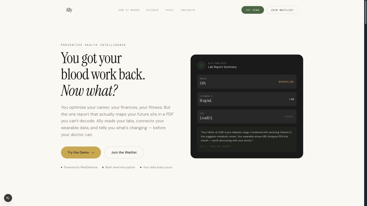 Ally Health needed a platform that makes complex lab results feel simple and actionable. We designed and engineered a health intelligence product that reads blood work, connects wearable data, and maps future health risks — before your doctor can.